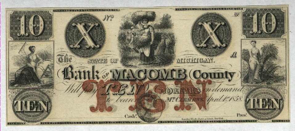 This is an 1858 $10 Bank of Macomb County note.