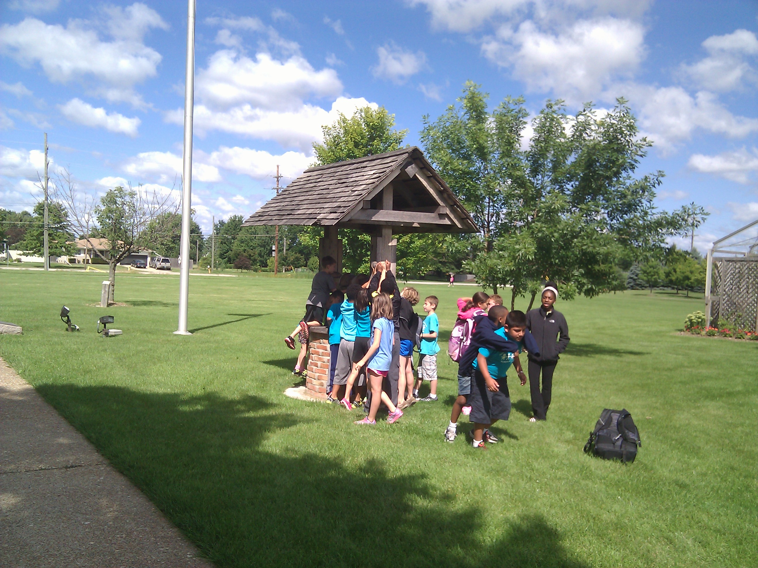 Kids from the Detroit Arsenal Summer Camp practice that team effort helps turn a stuck crank on a well.